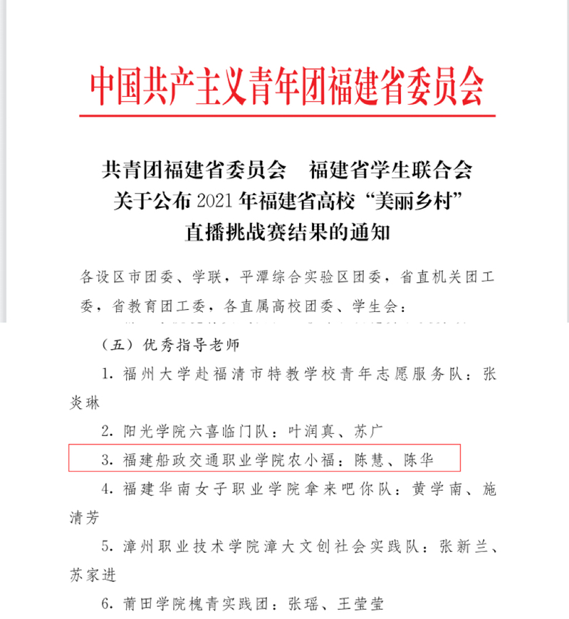 2021年福建省高校“美麗鄉(xiāng)村”直播挑戰(zhàn)賽優(yōu)秀指導老師.