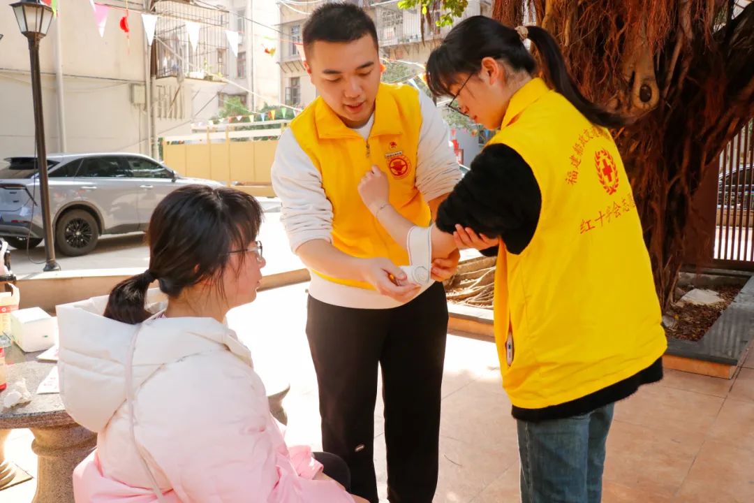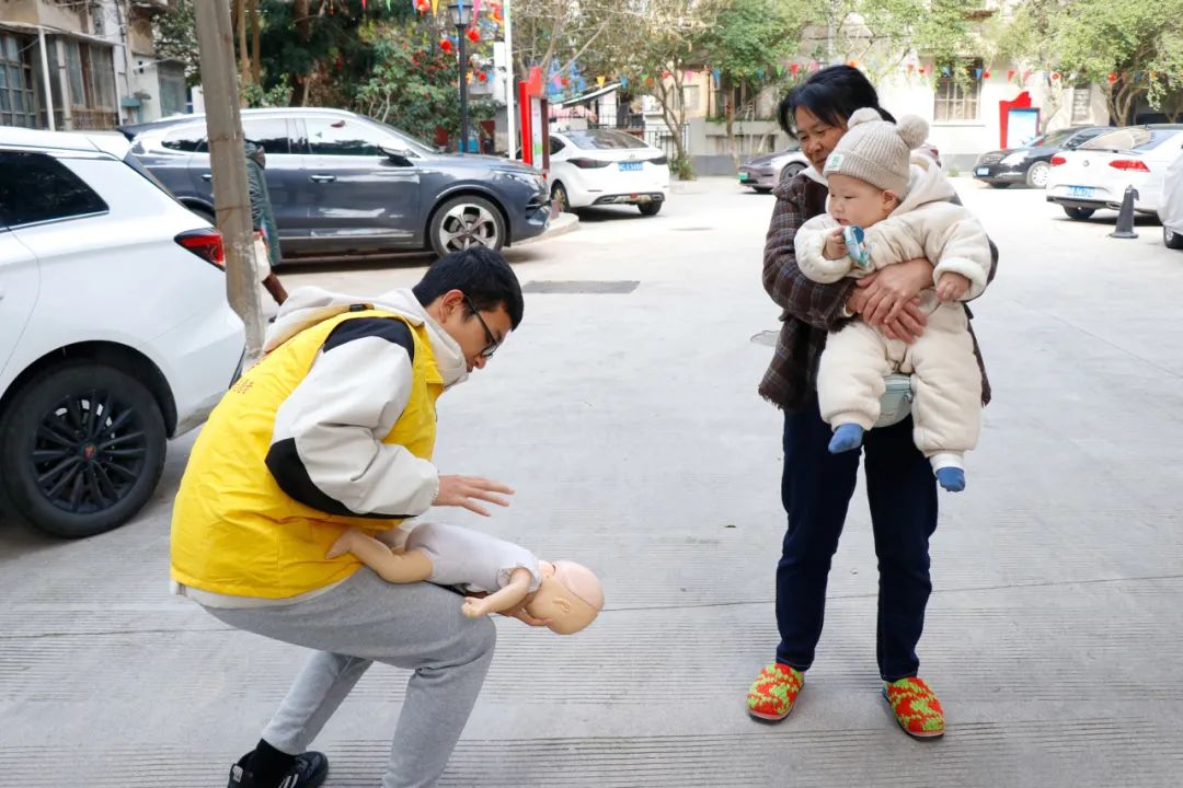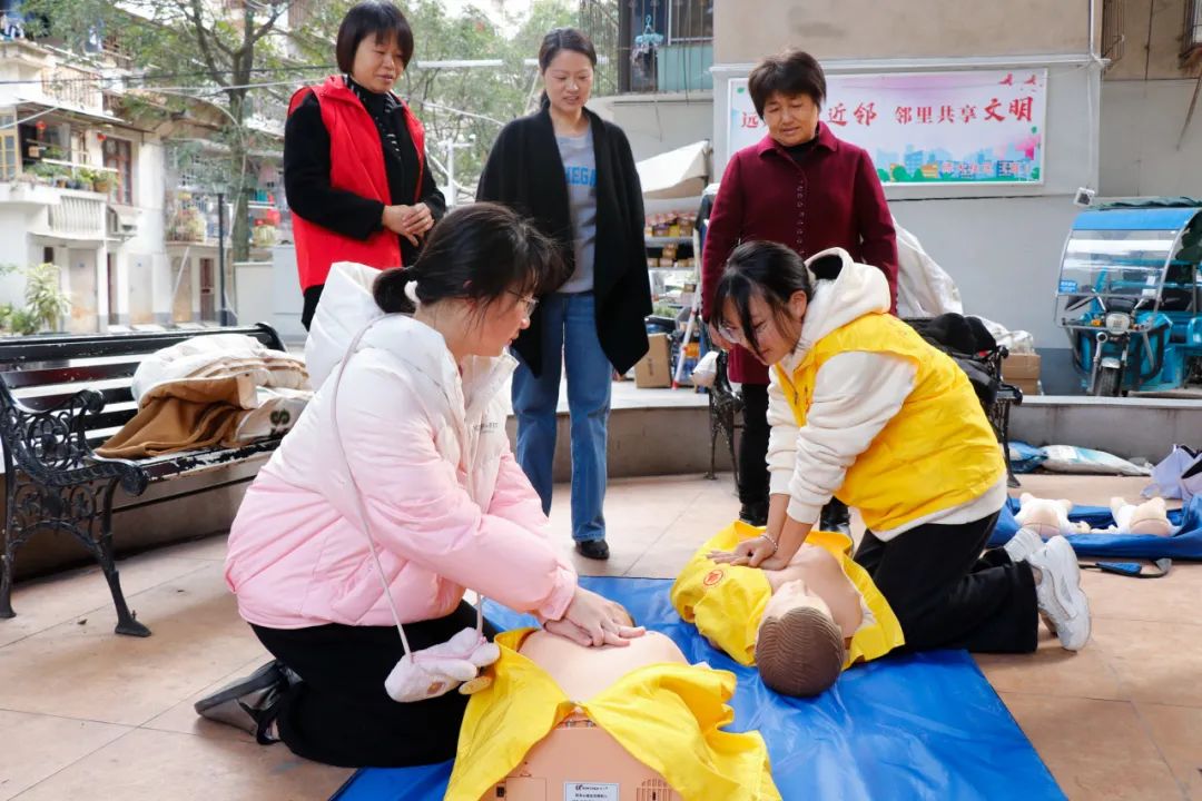 志愿者先向居民講解有關(guān)心肺復(fù)蘇救護(hù)、海姆立克急救法和包扎的基本常識與應(yīng)用環(huán)境,隨后居民在志愿者們的協(xié)助下進(jìn)行實(shí)操,如在仿真人體上演練心肺復(fù)蘇和海姆立克急救法,真人練習(xí)三角巾包扎,讓居民們對于急救知識有了深入的了解。