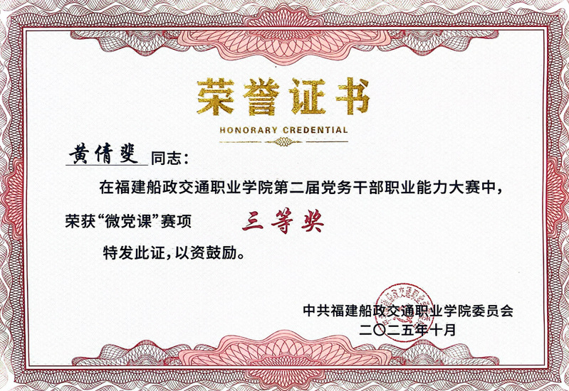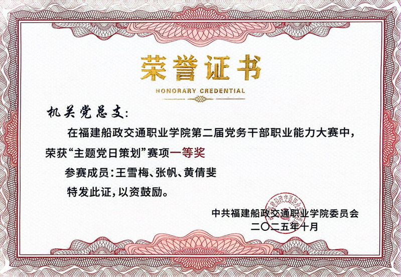 本次大賽設(shè)有黨務(wù)知識(shí)測試、主題黨日活動(dòng)策劃、談心談話、微黨課四個(gè)賽項(xiàng)。主要考察黨員高校黨務(wù)工作知識(shí)和實(shí)操,重點(diǎn)考察黨務(wù)干部綜合運(yùn)用理論分析、研判、解決黨務(wù)工作具體問題的能力。比賽中,機(jī)關(guān)黨總支代表隊(duì)成員分工協(xié)作、各展所長。在黨務(wù)知識(shí)測試環(huán)節(jié)沉著應(yīng)答,展現(xiàn)了深厚的理論素養(yǎng);在主題黨日活動(dòng)策劃環(huán)節(jié),以新穎的思路、詳實(shí)的方案和可落地的執(zhí)行路徑贏得評委一致好評,成功榮獲該賽項(xiàng)一等獎(jiǎng);談心談話環(huán)節(jié)中,隊(duì)員們精準(zhǔn)把握溝通技巧,展現(xiàn)了自己的引導(dǎo)能力和解決問題能力;在微黨課環(huán)節(jié),黃倩斐同志以《從船政學(xué)堂到職教強(qiáng)校:一場跨越百年的“育人報(bào)國”接力》為題,結(jié)合歷史脈絡(luò)與職教實(shí)踐,以生動(dòng)案例和深刻感悟傳遞初心使命,最終榮獲該賽項(xiàng)三等獎(jiǎng)。